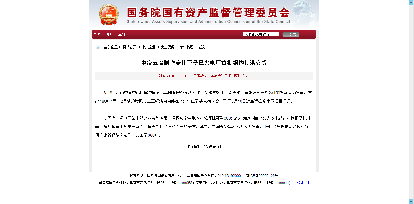國資委報道:中冶五冶制作贊比亞曼巴火電廠首批鋼構(gòu)集港交貨
