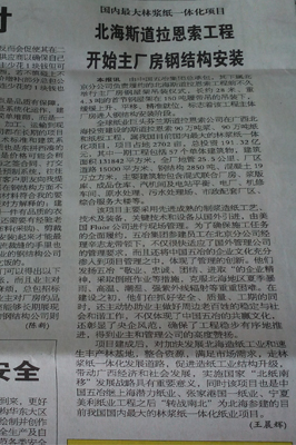 文章指出,北海斯道拉恩索工程由全球紙業(yè)巨頭芬蘭斯道拉恩索公司在廣西北海投資建設(shè)的,屬我國目前國內(nèi)最大的林漿紙一體化項目,該項目主要采用先進(jìn)成熟的制漿造紙工藝、技術(shù)及裝備,關(guān)鍵技術(shù)和設(shè)備從國外引進(jìn),由美國Fluor公司現(xiàn)場管理,該項目建成后,將加快發(fā)展北海造紙工業(yè)和速生豐產(chǎn)林基地,對帶動廣西經(jīng)濟(jì)和社會發(fā)展,實施國家“北紙南移”發(fā)展具有重要意義。建設(shè)過程中,中國五冶參建員工不僅很快適應(yīng)了國外管理公司的管理要求,還將中國五冶的企業(yè)文化充分滲入到項目管理之中,體現(xiàn)了管理的創(chuàng)新。建設(shè)之初,中國五冶在抓安全、質(zhì)量、工期的同時,還主動協(xié)助業(yè)主做好周邊百姓的穩(wěn)定和社會和諧工作,不僅體現(xiàn)了中國五冶的共贏文化,還彰顯了央企風(fēng)范,確保了工程穩(wěn)步有序地推進(jìn),得到業(yè)主和管理公司的高度贊揚(yáng)。(廖安秀)