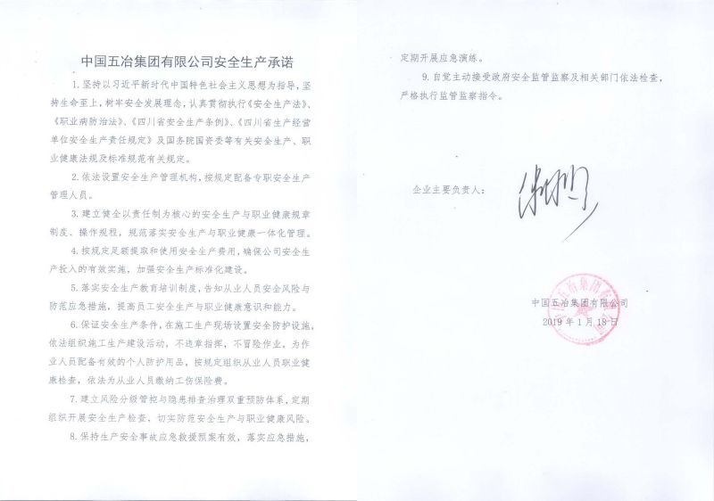中國五冶集團有限公司2019年安全生產承諾